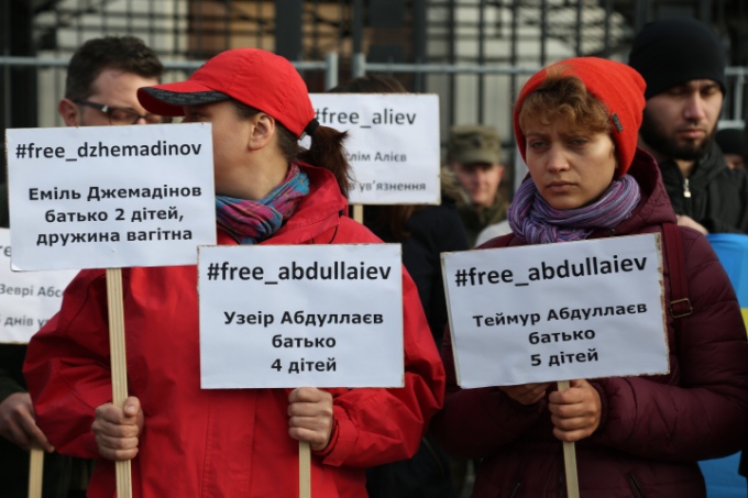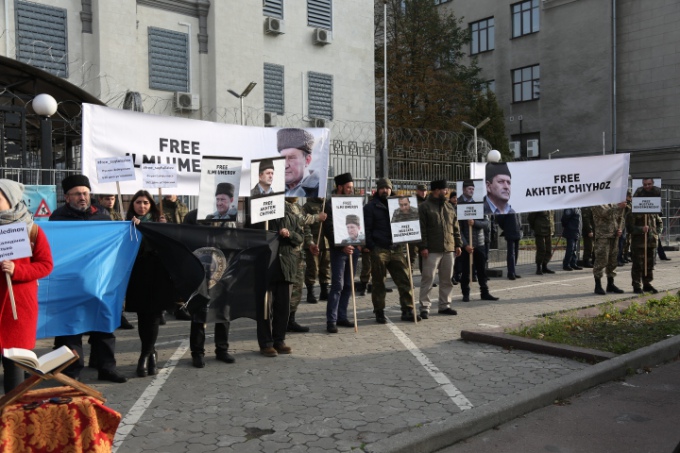 Учасники іншої акції, які протестували проти затримання в окупованому Криму кримських татар та незаконних обшуків, тримали таблички з іменами в'язнів ФСБ. Вони розповіли історії затриманих 12 жовтня в Криму і наголосили на політичній вмотивованості цих переслідувань.