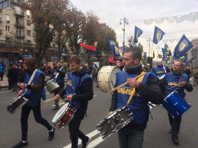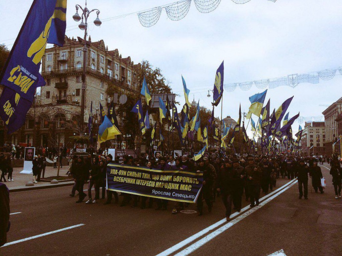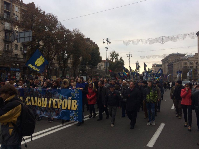 Активісти українських націоналістичних організацій і політичних сил провели у центрі Києва віче, приурочене 74-й річниці створення Української повстанської армії, після чого відбулася урочиста хода "Марш нації" до Михайлівсько площі.