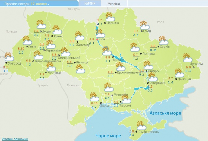 У понеділок, 17 жовтня, очікується суха погода, температура вночі - до -3 градусів.