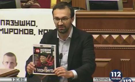 Стоячи на трибуні Верховної Ради, Лещенко показав обкладинку останнього числа журналу "Новое время", на якій зображено Ляшка із вилами.