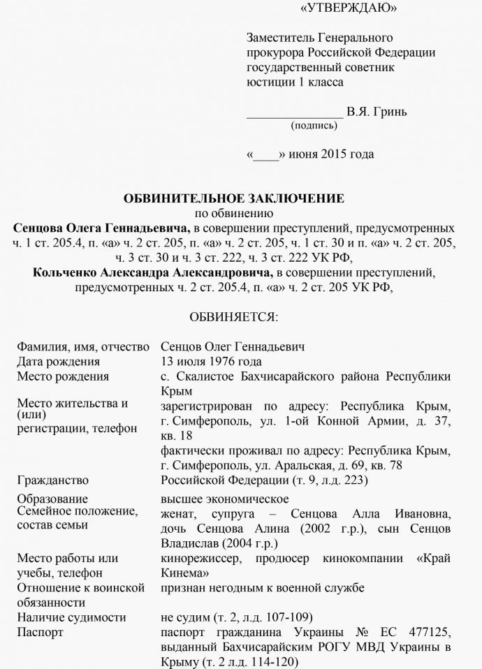 Вона зазначила, що в обвинувальному висновку у справі Сенцова написано, що він є громадянином України, і наводяться дані його українського паспорта.