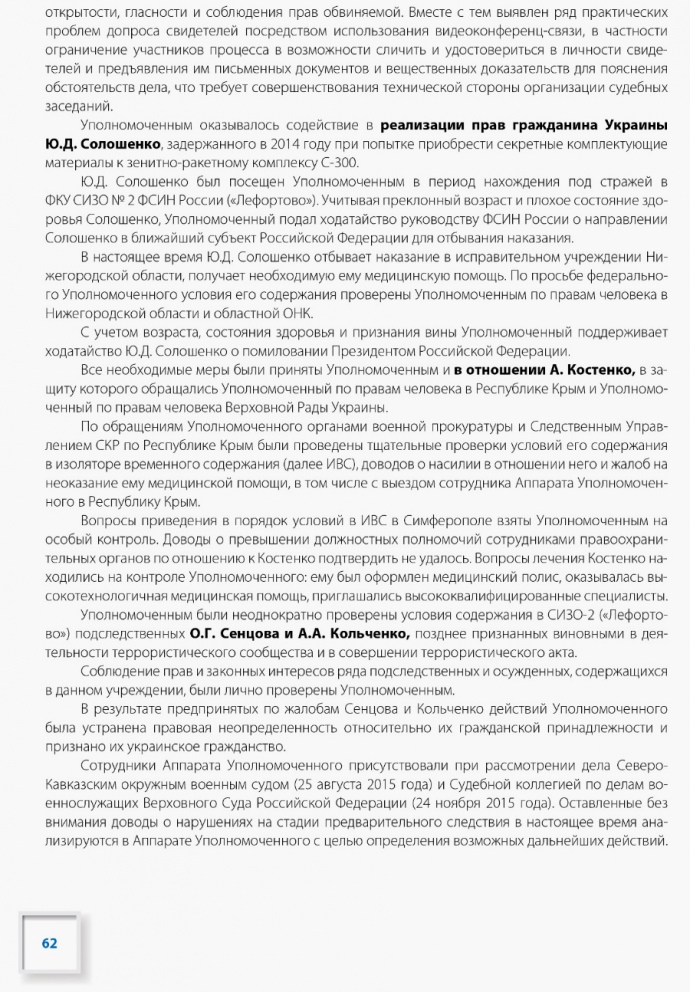 Правозахисниця привела текст, розміщений на 62 сторінці доповіді: "В результаті вжитих за скаргами О. Г. Сенцова і О. О. Кольченка дій Уповноваженим була усунена правова невизначеність щодо їхньої громадянської належності та визнання їх українськими громадянами".