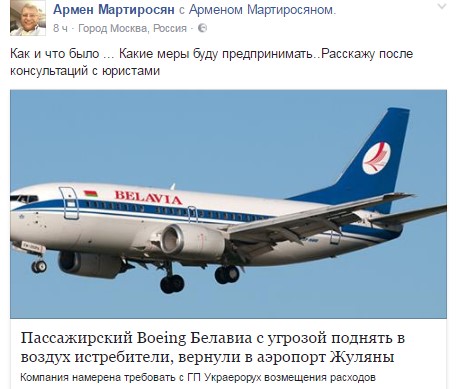 Те, що Мартиросян перебував у літаку та причетний до події, випливає з його допису на сторінці у Facebook.