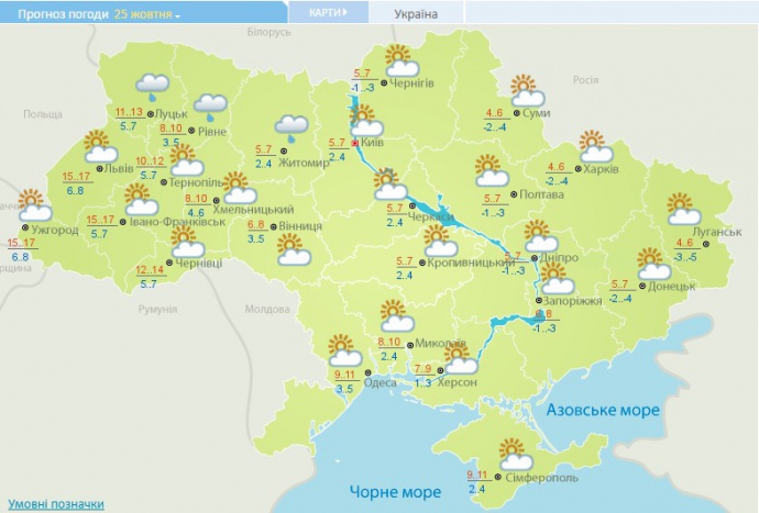 На 25 жовтня синоптики прогнозують погоду без істотних опадів, у Волинській, Рівненській та Житомирській областях невеликий дощ. Вітер південний, південно-східний, 7-12 м/с, у західних областях і східній частині подекуди пориви 15-20 м/с, у Приазов'ї до 24 м/с.