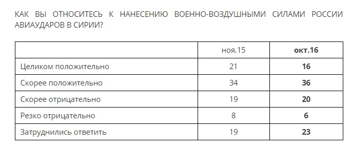 Підтримка населенням втручання Росії в сирійський конфлікт за рік істотно не змінилася, отримуючи схвалення кожного другого учасника опитування.