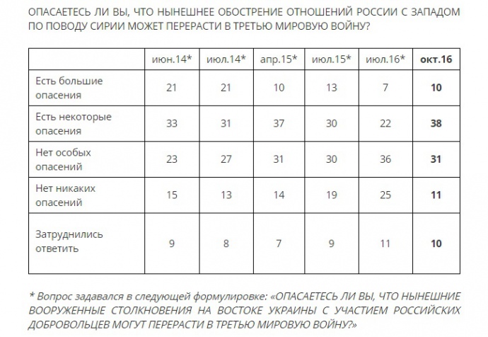 Так, на питання: "Чи побоюєтеся Ви, що нинішнє загострення відносин Росії із Заходом з приводу Сирії може перерости в третю світову війну?", - 48% зізналися, що у них є такі побоювання. У 11% немає ніяких побоювань з цього приводу, інші не знали, що відповісти.