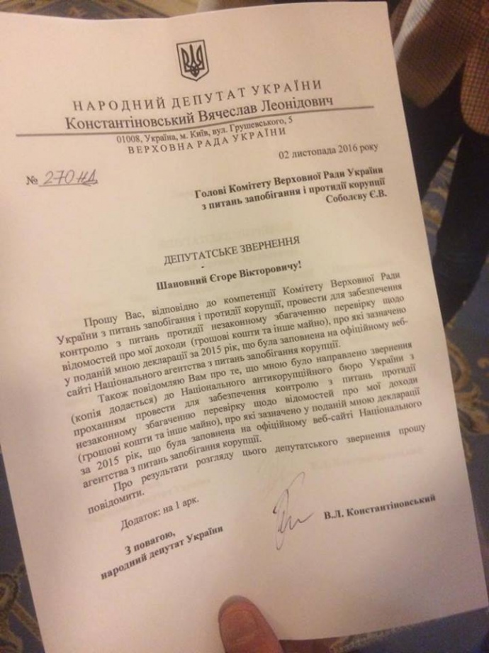 Народний депутат позафракційний В'ячеслав Констянтиновський, хоче, щоб НАБУ перевірило його доходи.