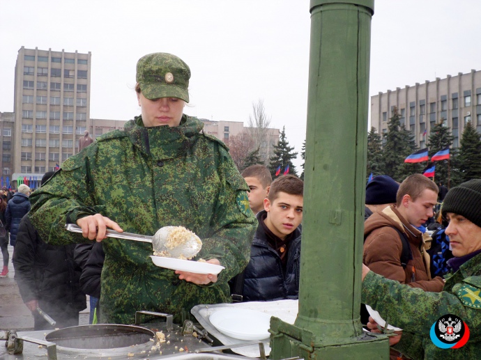 У Горлівці заходи приурочили до Дня військової слави - на російський манер. Там немає комуністичних прапорів, а тільки прапори так званої ОРДО. У Горлівці на площі багато молоді.