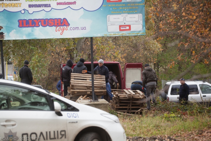 Також повідомляється, що близько 11:00 до місця, це проходить акція, під’їхав мікроавтобус, з якого активісти ви грузили дерев’яні піддони. Їхнього призначення вони не пояснили.