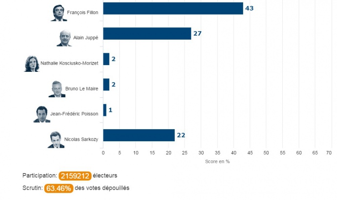 Станом на 23:00, за даними підрахунку 63% голосів виборців на "праймеріз", Фійон отримує 43% голосів, Жюппе - 27%, Саркозі - 22%.