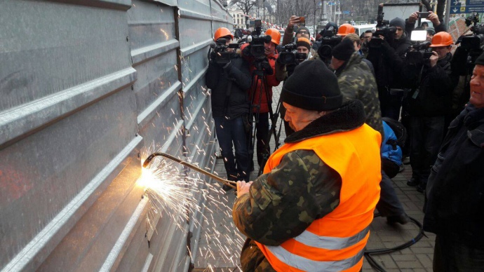 Столична влада почала демонтаж незаконної надбудови над Будинку профспілок.