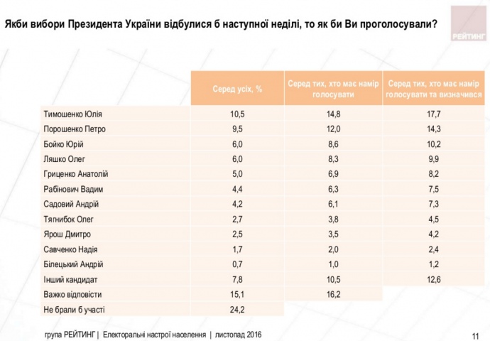 Серед тих, хто має намір брати участь у виборах і визначився зі своїм вибором, 17,4% проголосували б за "Батьківщину", 12,6% – за БПП, 11,1% – за "Опозиційний блок", 8,4% – за Радикальну партію Ляшка, 7,4% – за "Самопоміч", 6,2% – за партію "За життя", 6,1% – за "Свободу", 5,6% – за "Громадянську позицію".
