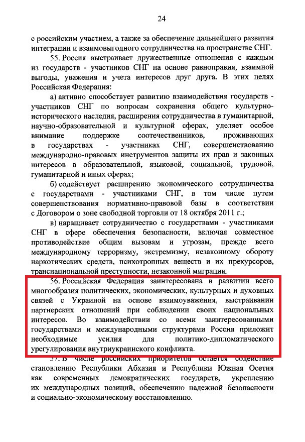 Щодо України вказується, що "Російська Федерація зацікавлена в розвитку всього різноманіття політичних, економічних, культурних і духовних зв'язків із Україною на основі взаємоповаги, вибудовування партнерських відносин у разі дотримання своїх національних інтересів".