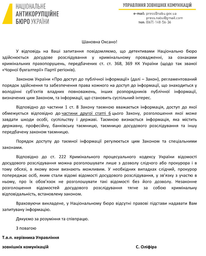 Однак у відповідь на всі ці питання, в НАБУ "Українській правді" на цілій сторінці пояснили, що у НАБУ "відсутні правові підстави надавати запитувану інформацію".
