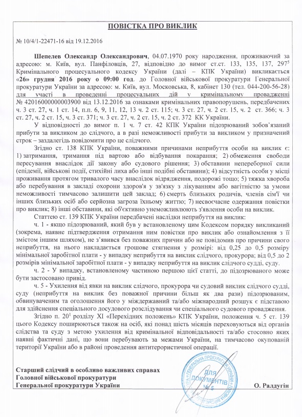 Так в одній із повісток сказано, що Шепелєв викликається на допит до Головної військової прокуратури Генпрокуратури 26 грудня на 9 годину "для участі в проведенні процесуальних дій у кримінальному провадженні № 42016000000003900 від 13.12.2016 за ознаками кримінальних правопорушень, передбачених ч. 3 ст. 27, ч. 1 ст. 14, п.п. 6, 9, 11, 12, 13 ч. 2 ст. 115; ч. 3 ст. 27, ч. 2 ст. 15, ч. 2 ст. 366; ч. 3 ст. 27, ч. 2 ст. 15, ч. 3 ст. 371; ч. 3 ст. 27, ч. 2 ст. 15, ч. 2 ст. 372 КК України (Притягнення завідомо невинного до кримінальної відповідальності, поєднане з обвинуваченням у вчиненні тяжкого або особливо тяжкого злочину).