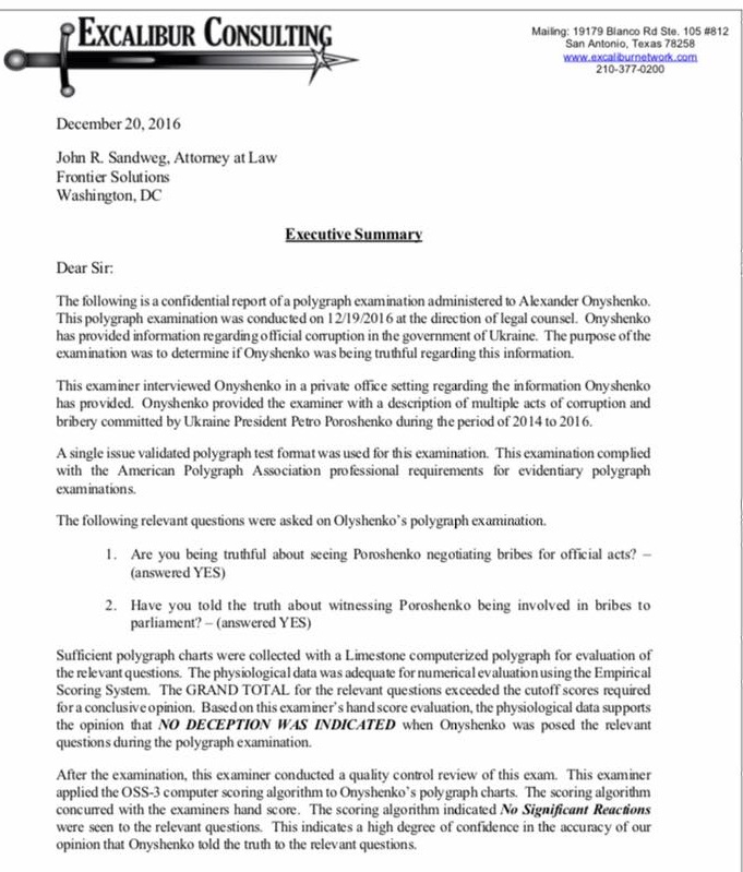 Він також опублікував висновки перевірки на бланку компанії Excalibur Consulting. У документі підкреслюється, що перевірка не виявила обману в словах Онищенка.