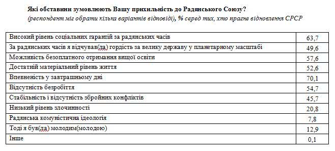 Ті, хто прагне відновлення Радянського Союзу, найчастіше обґрунтовують це тим, що за часів СРСР були впевненість у завтрашньому дні (70%), високий рівень соцгарантій (64%), безоплатна вища освіта (58%), не було безробіття (55%), матеріальний рівень життя відчувався достатнім (53%), люди відчували гордість за велику державу (50%), людей тішила стабільність і відсутність збройних конфліктів (46%).