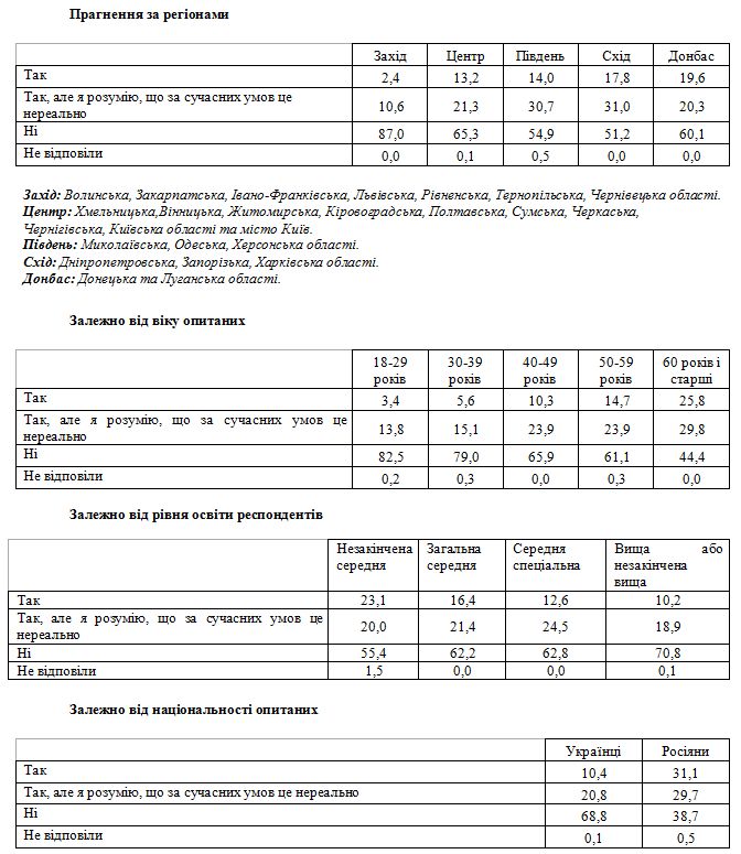 Серед тих, хто вважає себе етнічно українцями, не прагнуть відновлення Радянського Союзу 69%, а серед "етнічних росіян" – лише 39%.