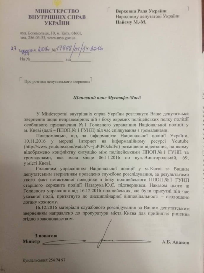 "Головним управлінням Нціональної поліції у місті Київ проведено службове розслідування, яке підтвердило факт нетактовної поведінки з боку поліцейського ППОП №1 ГУНП старшого сержанта поліції Назарука Ю.С. Наказом цього ж управління від 16.12.2016 поліцейських, які були присутні під час указаної події, притягнуто до дисциплінарної відповідальності – оголошено догану кожному", - йдеться у відповіді на звернення депутата.
