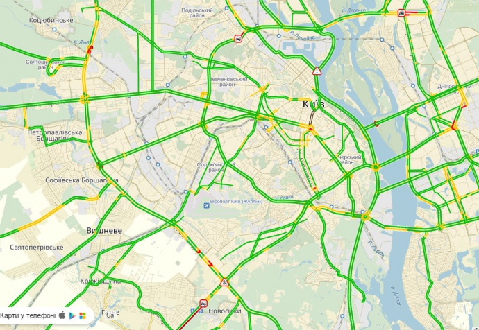За даними сервісу "Яндекс.Пробки", станом на 16:30 у Києві затори на дорогах через негоду не перевищують 2 балів. Варто зауважити, що при цьому тротуари та дорожне покриття навіть на центральних вулицях столиці - у снігу, а машин і громадського транспорту досить небагато.