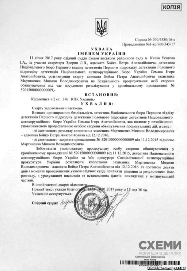 Солом’янський суд міста Києва своєю ухвалою від 11 січня не зобов’язував детективів НАБУ закрити справу щодо екс-нардепа Миколи Мартиненка, а зобов’язав їх розглянути клопотання захисника депутата та протягом 10 днів винести рішення з цього приводу.
