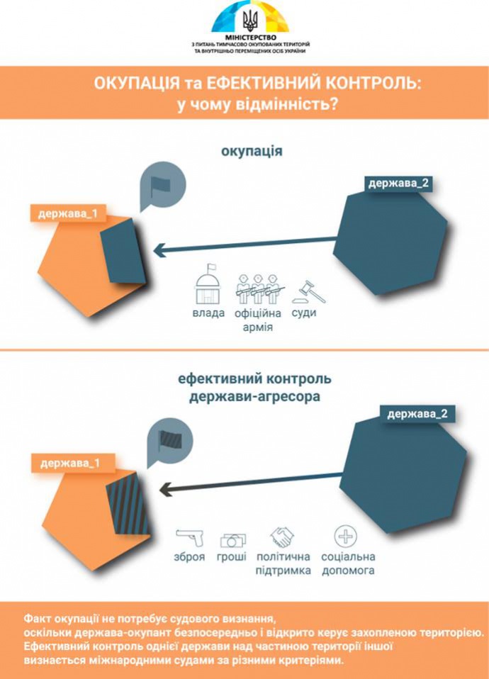 У Криму відповідно до норм міжнародного права присутня класична окупація, а на частині Донбасу встановлено "ефективний контроль" з боку РФ.