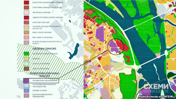 "Схеми" дізналися також, що ця земельна ділянка віддана в оренду до 2027 року фірмі ТОВ "Підприємство "Київ". Проаналізувавши структуру власності цієї фірми, було виявлено в ній компанії, пов'язані з колишнім бізнес-партнером Порошенка Костянтином Григоришиним, співкерівником виборчого штабу БПП Давидом Жванією та ще одним давнім бізнес-компаньйоном Порошенка Олегом Гладковським.