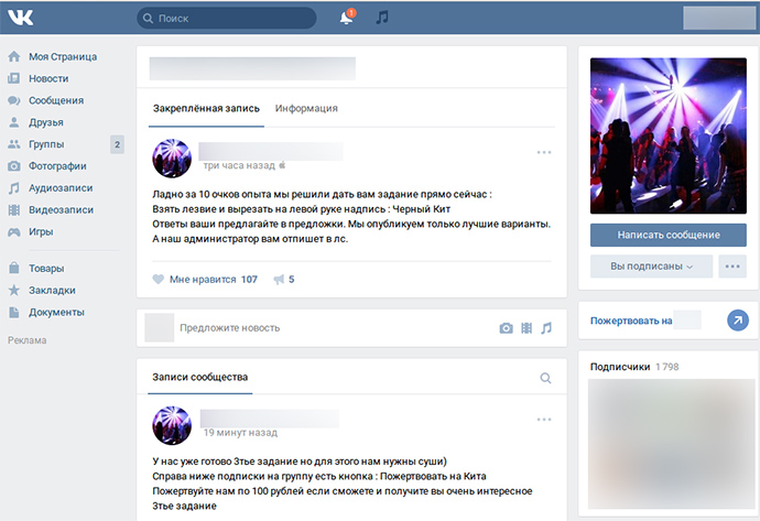Адміністратор групи схиляє дитину до виконання завдань (квестів), причому практично всі завдання передбачають нанесення дитині власноруч каліцтв або заподіяння болю. Всі ці "квести" в обов’язковому порядку знімаються на відео.
