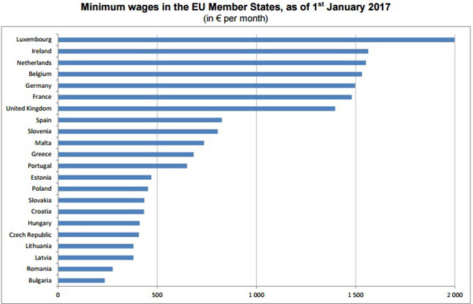 У січні 2017 року десять держав-членів, розташованих в східній частині ЄС, мали мінімальну зарплату нижче 500 євро за місяць: Болгарія (235 євро), Румунія (275 євро), Латвія і Литвв (по 380 євро), Чехія (407 євро), Угорщина (412 євро), Хорватія (433 євро), Словаччина (435 євро), Польща (453 євро) і Естонія (470 євро).