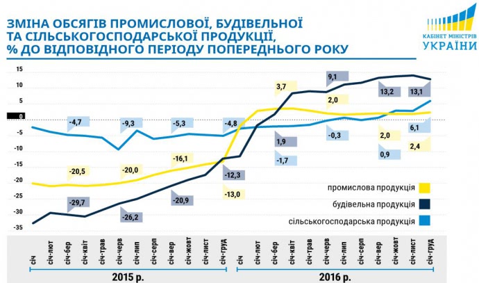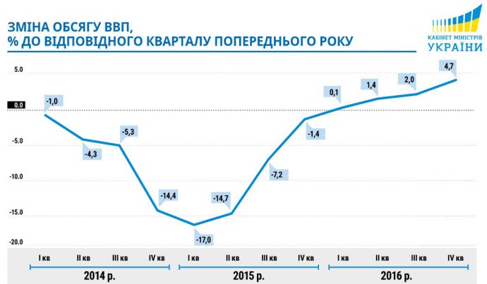 "Якщо ми відчували економічне падіння включно з 2015 роком, то у 2016 році нам вдалося забезпечити з другого півріччя більш серйозне зростання, яке дорівнювало 2,2% економічного зростання по відношенню до минулого року. Ми в четвертому кварталі мали зростання економіки в 4,7% ВВП", – сказав Гройсман.