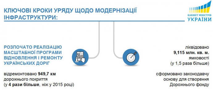 "У 4 рази збільшили кількість відремонтованого дорожнього полотна, ліквідували в 1,5 рази більше "ямковості", – сказав також прем’єр і нагадав, що Український дорожній фонд запрацює з 2018 року.