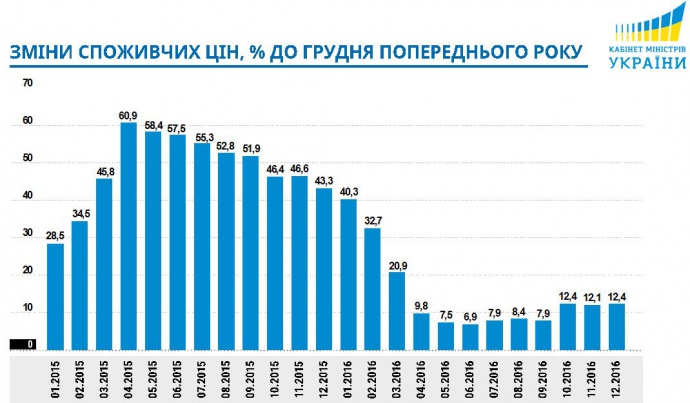 Щодо споживчих цін, то прем’єр сказав, що в 2015 році інфляція склала більше 43%, а у 2016 році вдалося утримати інфляцію на рівні 12,4%.