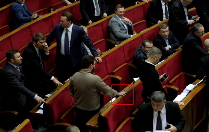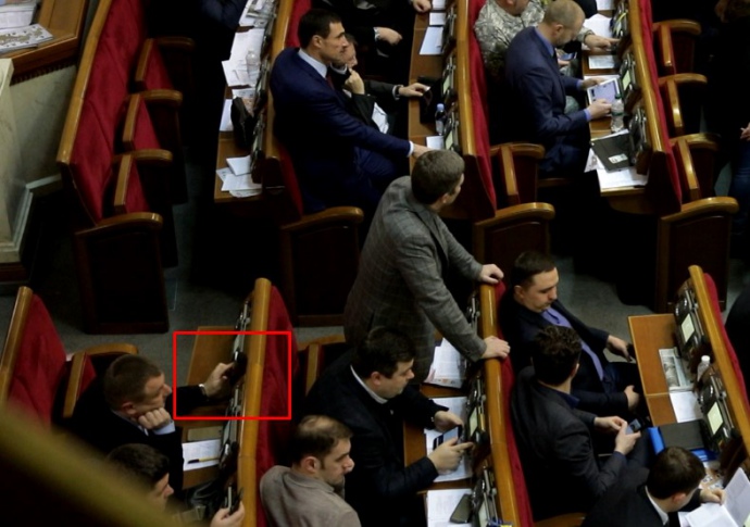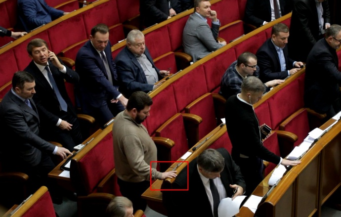На відео помітно, що під час голосування депутат натискає кнопку на своєму місці, а потім встає, і схилившись над порожнім місцем праворуч, кнопкодавить.