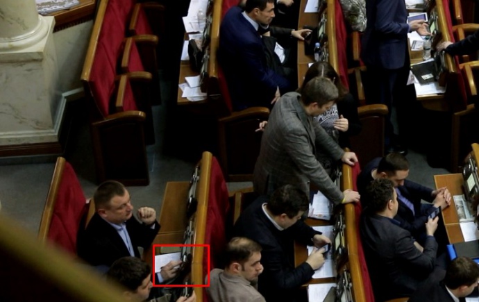 Також під час голосування за законопроект №5259 про внесення змін до статті 72 Кримінального кодексу України щодо удосконалення порядку зарахування строку попереднього ув'язнення депутат від "Народного фронту" Михайло Хміль, прикриваючись піджаком, голосував за колегу.