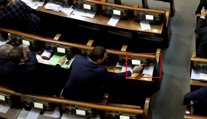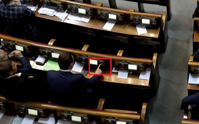 Під час голосування депутат, окрім свого місця натискає кнопку на порожньому місці праворуч.