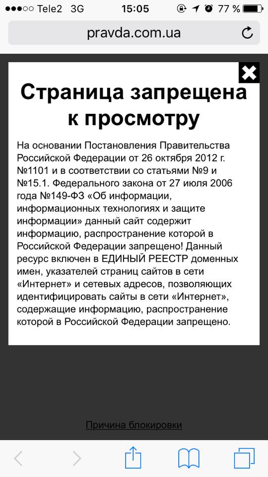 Згідно з іншим повідомленням, користувачів попереджають, що сайт УП "містить інформацію, поширення якої в РФ заборонено".