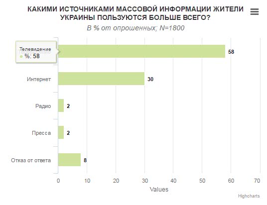 Наразі, як свідчить опитування, приблизно 9 з 10 дорослих громадян України більш-менш регулярно отримують новини за допомогою телебачення, а близько половини - через Інтернет.