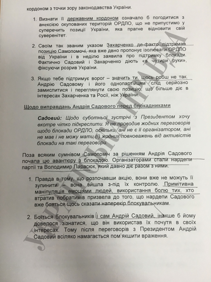 "Своїм так званим указом Захарченко де-факто підтримав позицію Самопомочі, яка вже давно пропонує ізолювати ОРДЛО від України, і в неділю заявила про підтримку блокади. Фактично Садовий і Захарченко діють "в чотири руки", фіксуючи розрив України", - сказано у темнику.