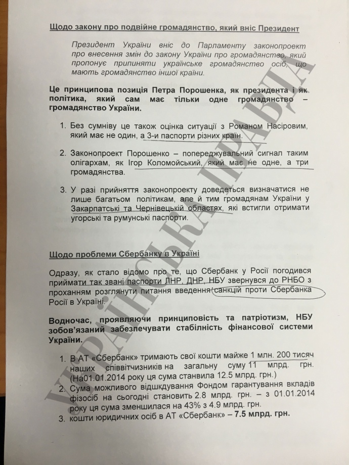 Адміністрація президента розіслала темники депутатам БПП, які стосуються, зокрема, законопроекту президента про подвійне громадянство, діяльності російських банків в Україні та блокади Донбасу.