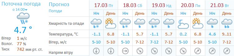 У ніч на 17 березня по всій Україні очікується дощ із мокрим снігом, а вдень у п’ятницю на заході й півночі – без суттєвих опадів, а на сході й півдні – дощі.
