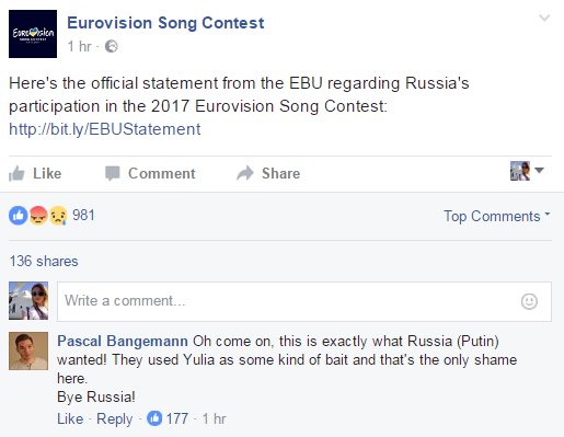 Європейська мовна спілка, яка є організатором пісенного конкурсу Євробачення, розчарована рішенням України заборонити в'їзд представниці Росії Юлії Самойловій.