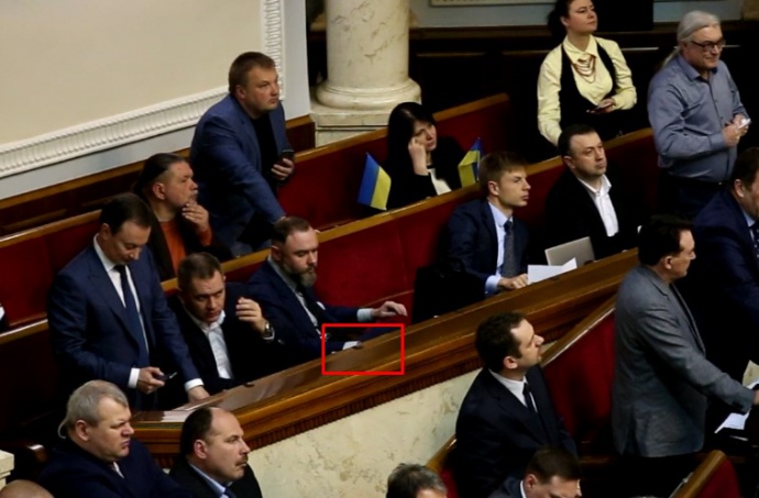 В момент голосування видно, як депутат тисне кнопку на одному місці, а іншою рукою, прикриваючись папірцем, голосує на місці ліворуч.