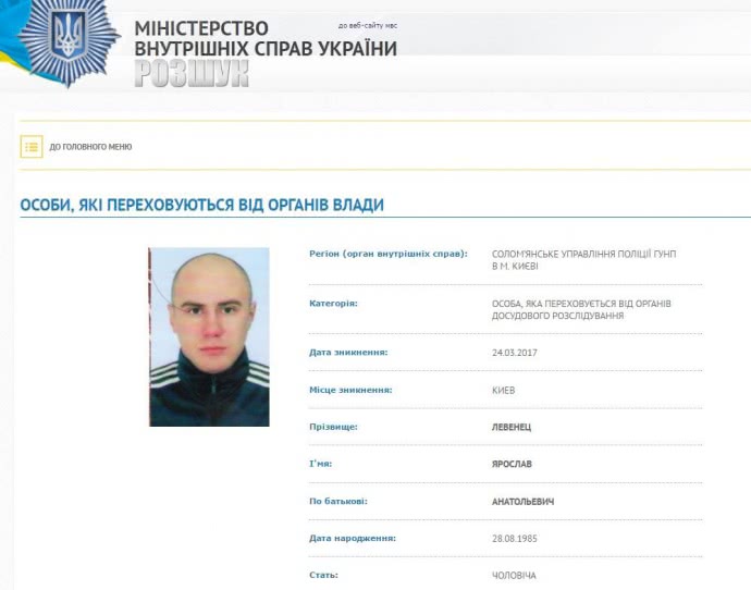 Національна поліція розшукує Ярослава Левенця, якого ЗМІ називають спільником вбивці колишнього депутата Держдуми Дениса Вороненкова.