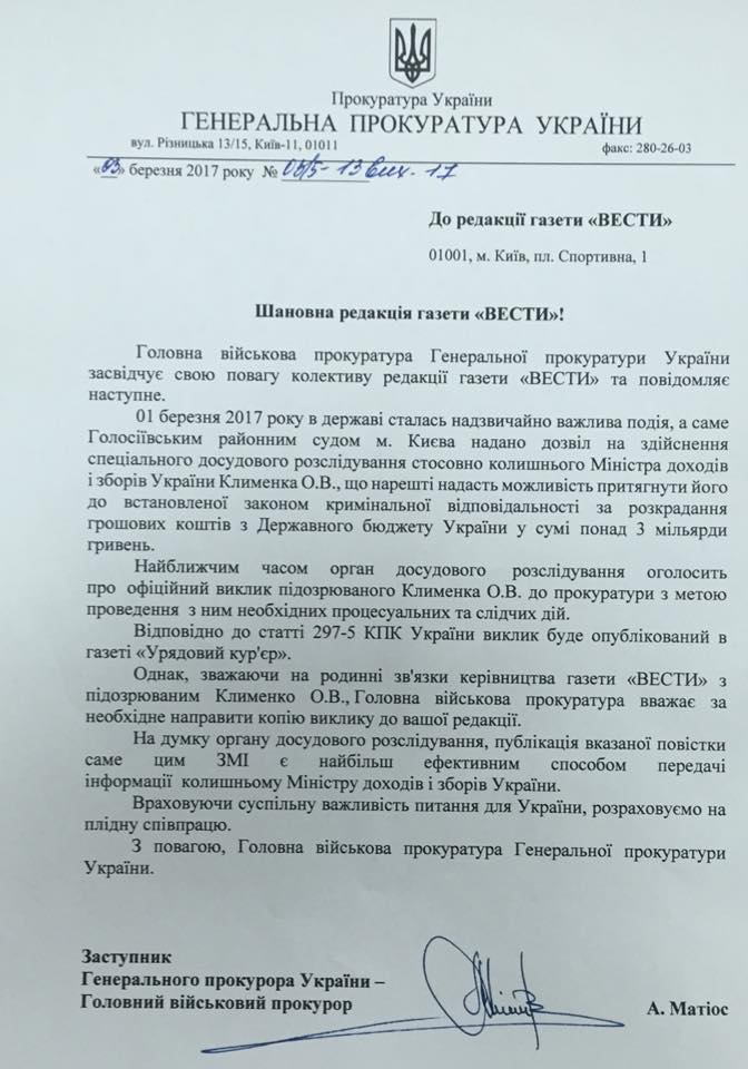 "Зважаючи на родинні зв'язки керівництва газети "Вєсті" з підозрюваним Клименком, Головна військова прокуратура вважає за необхідне направити копію виклику до вашої редакції", - сказано в листі.