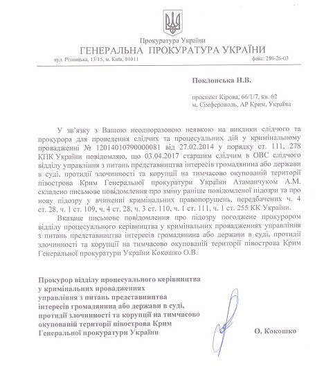 ГПУ просить Печерський райсуд Києва надати дозвіл на проведення спеціального досудового розслідування стосовно так званого прем’єра окупованого Криму Сергія Аксьонова та російського "прокурора" півострова Наталії Поклонської.