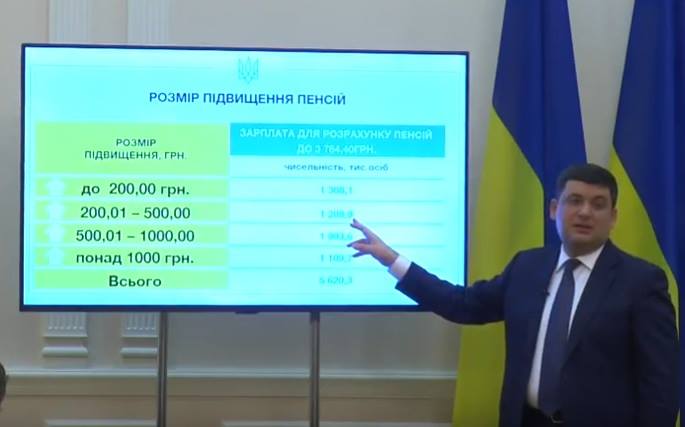 "Приблизно 1 мільйон 308 тисяч громадян отримають підвищення пенсій до 200 гривень. 1 мільйон 208 тисяч громадян отримають підвищення, при сьогоднішньому курсі валют, від 200 до 500 гривень щомісячно. 1 мільйон 903 тисячі громадян отримають підвищення від 500 до 1000 гривень на місяць. Це не разова подачка, яку деякі політикани намагалися робити, – це постійна система. І ще 1 мільйон 109 тисяч громадян отримають понад 1000 гривень щомісячної доплати", – уточнив Гройсман.
