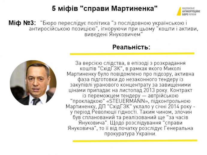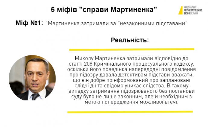 Зокрема роз'яснюється, що міфом є твердження, що Мартиненка затримали нібито за незаконними підставами, що він нібито не ховався від розслідування, що він брав участь у реформуванні енергетичної сфери України, "захищаючи її від посягань російських олігархів", і що справу Мартиненка "сфальсифіковано з метою політичного переслідування".