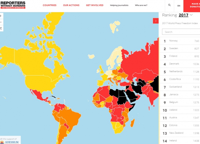 Останніми у рейтингу розмістилися Туркменістан, Еритрея та Північна Корея.