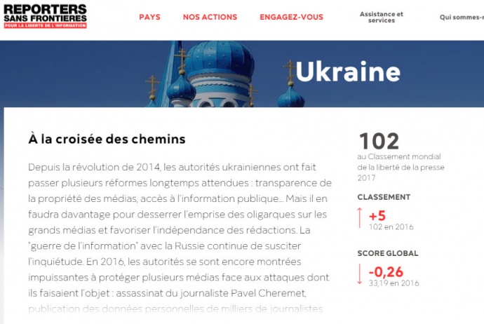 Україна піднялася на 5 сходинок у рейтингу свободи преси міжнародної організації "Репортери без кордонів".