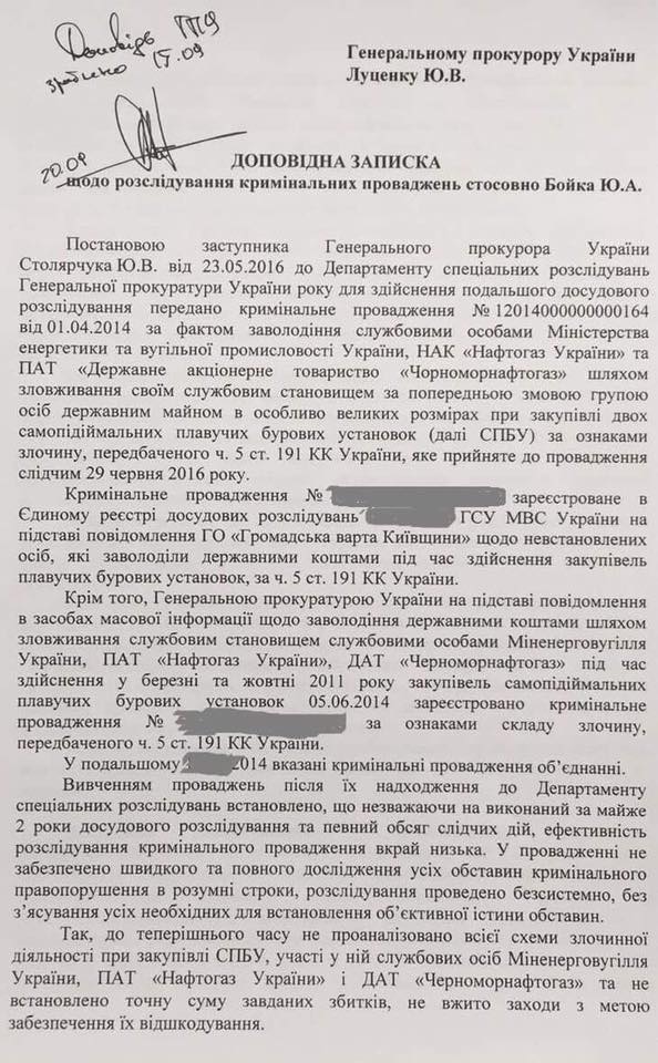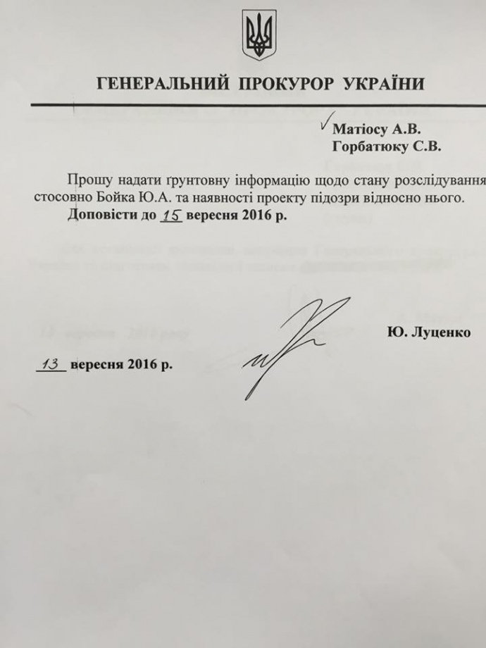 Так, в ГПУ навели неповну копію доповідної записки начальника департаменту Спецрозслідувань Сергія Горбатюка від вересня 2016 року у відповідь на прохання Луценка повідомити про стан розслідування щодо Бойка від 13 вересня 2016 року.
